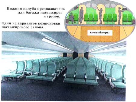 Выбранная фома обеспечивает минимальные габариты самолета при условии размещения в фюзеляже 300–350 пассажиров в трех салонах с тремя главными проходами шириной не менее 500 мм и шагом кресел не менее 810 мм. При экономической компоновке число пассажирских мест может быть увеличено до 400.