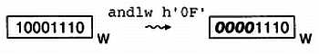 В командах, работающих с константами, младшие 8 бит кода команды используются для указания операнда-источника, являющегося в данном случае константой, а не байтом в регистре данных. Например, команда addlw 06 кодируется как b’11111000000110’. Операндом-адресатом в командах такого типа всегда является рабочий регистр, что и отражено в мнемоническом обозначении. Так, в нашем примере сумма W + 6 копируется обратно в рабочий регистр W. На языке регистровых передач эта операция выражается как W <- W + #6, где символ «#» (диез, или решетка) указывает, что стоящее после него число является константой, а не адресом регистра данных.