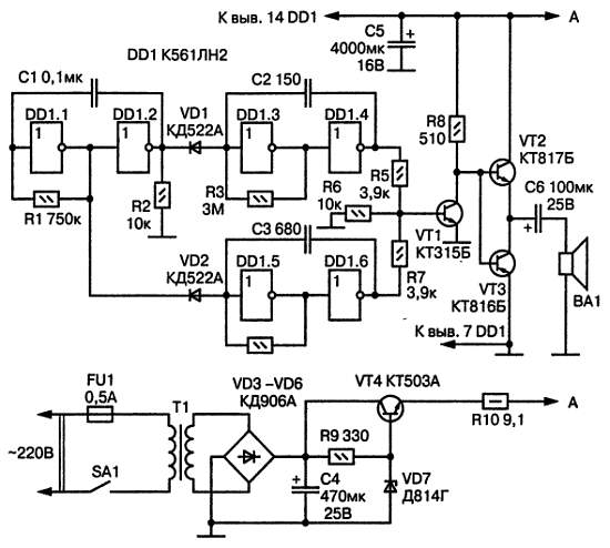 Звуковой сигнал типа трели образуется поочередной коммутацией сигналов близких звуковых частот, в связи с этим принципиальная схема этого звонка (рис. 29) содержит коммутирующий генератор прямоугольных импульсов с частотой повторения около 5 Гц на элементах DD1.1, DD1.2 и два генератора звуковых частот на элементах DD1.3, DD1.4 и DD1.5, DD1.6. Таким образом, генераторы звуковых частот работают поочередно, так как выходы элементов DD1.1 и DD1.2 противофазны. Выходные сигналы генераторов суммируются на резисторах R5-R7 и поступают на усилитель, собранный на транзисторах VT1-VT3 и нагруженный динамической головкой ВА1.