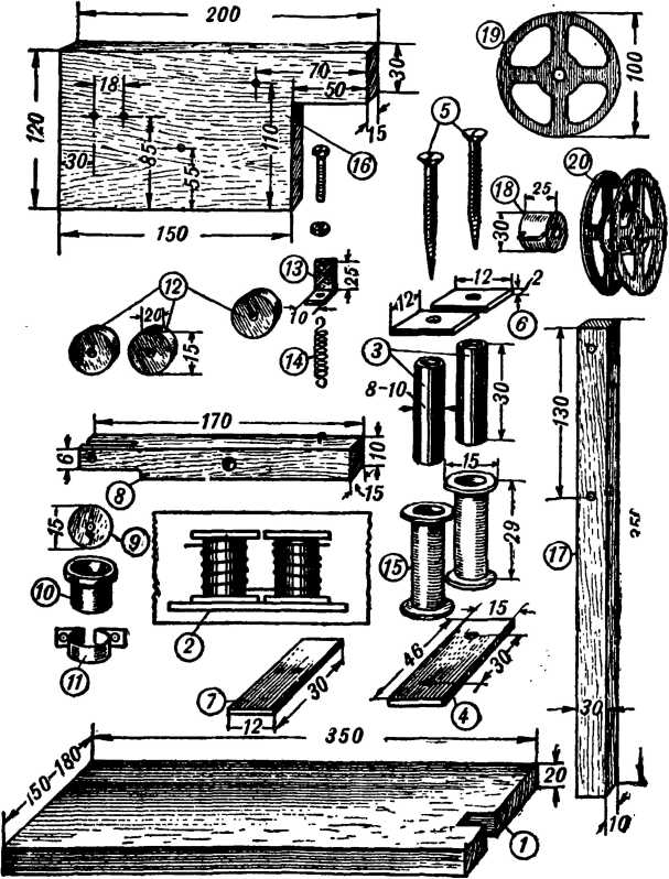 Все части телеграфного аппарата монтируют на деревянном основании 1 размером 350х160х20 миллиметров. Форма и размеры деталей телеграфного аппарата показаны на рисунке 85. В таком аппарате телеграфная лента протягивается телеграфистом.
