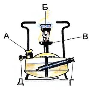 А — вентиль для залива керосина в бак; Б — горелка; В — чашечка для заливки топлива в момент розжига; Г — воздушный насос; Д — краник для выпуска воздуха при выключении примуса.