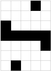 Тридцать пять — это произведение двух простых чисел, пять и семь. Что означало, что эти биты могут быть скомпонованы в пять строк по семь битов, или в семь строк по пять битов. Первый вариант, после превращения единиц в чёрные квадраты, а нулей — в белые, выглядел так: