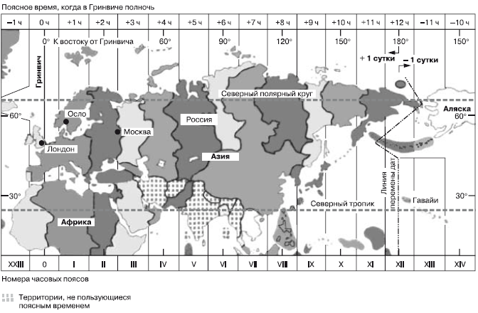 Во многих странах мира осуществляется переход на декретное время (от лат. decretum – указ, постановление) – поясное время, переведенное вперед или назад на 1 час с целью наиболее рационального использования светлой части суток (летнее или зимнее время). В России поясное время отличается от декретного на 1 час. Поэтому Москва, находясь во 2-м часовом поясе, практически живет по времени 3-го часового пояса. Таким образом, когда в Москве 13 часов (московское время), то в Париже – 11 часов (среднеевропейское время), в Лондоне – 10 часов (Гринвичское время) (рис. 7.2).