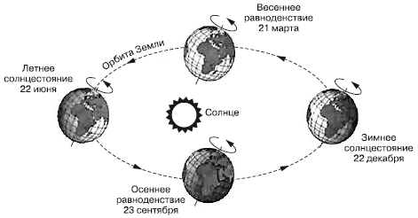 Смена времен года. На рис. 7.3 показано годовое движение Земли вокруг Солнца в разное время года. Летом Северное полушарие как бы повернуто к Солнцу, а зимой – наоборот. 23 сентября и 21 марта – дни осеннего и весеннего равноденствия, когда Солнце одинаково освещает оба полушария Земли. В этот день и в Северном и в Южном полушарии день равен ночи. 22 декабря – день зимнего солнцестояния: самый короткий день и самая длинная ночь в Северном полушарии. Земля обращена к Солнцу своим Южным полушарием. Там лето. У нас зима.