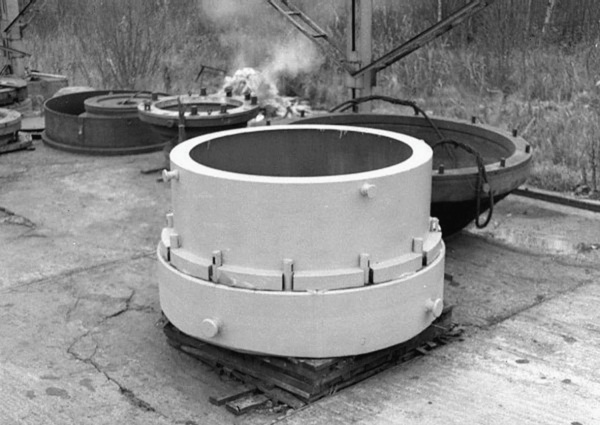 Вот тогда-то ленинградские ученые и инженеры всемирно известного Кировского завода и разработали оригинальные методы взрывной штамповки. Технология процесса стала выглядеть так. Железобетонный блок состоит из двух частей: нижняя – матрица, имеющая полость по форме детали, верхняя – крышка с вмонтированным в нее патронником. Патронник заряжается обычным охотничьим порохом, между крышкой и матрицей устанавливаются специальная смягчающая прокладка и металлический лист заготовки. Выстрел и в считаные доли секунды высокое давление пороховых газов вгоняет заготовку в матрицу.