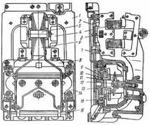 1 – основание пускателя, 2 – сердечник, 3 – упор, 4 – катушка, 5 – чека сердечника, 6 – якорь, 7 – пружина амортизации сердечника, 8 – камера, 9 – основание камеры, 10 – неподвижный контакт. 11 – подвижный контакт, 12 – контактная пружина, 13 – опорная колодка подвижного контакта, 14 – блок-контакты, 15 – возвратная пружина.