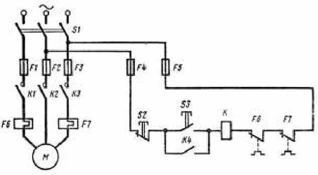 S1 – рубильник, F1, F2, F3 – предохранители, К1, К2, К3 – главные контакты, F4, F5 – предохранители в цепи управления, F6, F7 – нагревательные элементы и контакты электротеплового реле, S2 – кнопка «Стоп», S3 – кнопка «Пуск», К – катушка, К4 – блок-контакты.