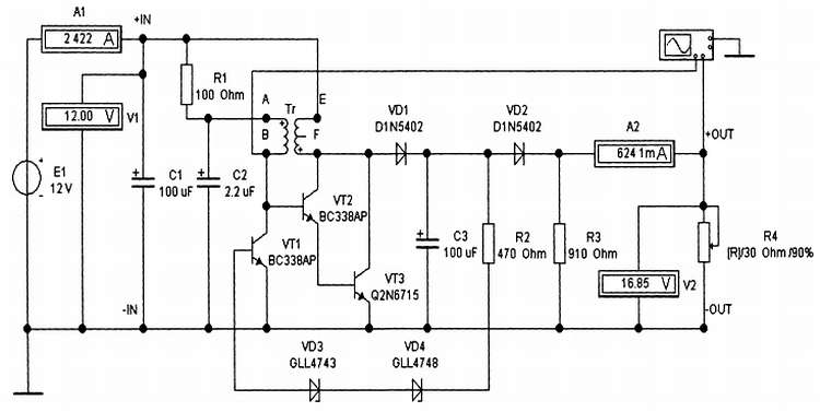 Схема преобразователя (рис. 95) представляет собой автогенератор на биполярном транзисторе VT1, усилительный каскад на транзисторах VT2 и VT3 по схеме Дарлингтона, выпрямитель на диодах VD1 и VD2, а также стабилизирующую обратную связь на стабилитронах VD3 и VD4.