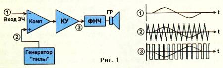 Он содержит генератор импульсов, ШИМ-модулятор, ключевой усилитель КУ, выходной фильтр нижних частот ФНЧ и нагрузку — динамическую головку громкоговорителя ГР или АС.