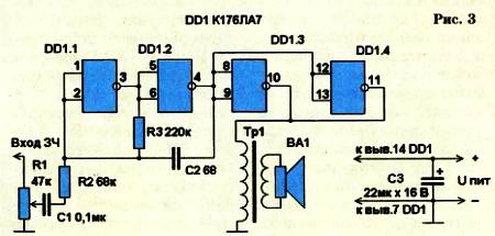 Дросселя ФНЧ не потребовалось, его роль с успехом выполняет индуктивность первичной обмотки выходного трансформатора Тр1, согласующего низкое сопротивление головки ВА1 (обычно 4–8 Ом) со значительно большим выходным сопротивлением усилителя. На входе усилителя установлен регулятор громкости R1. Все эти элементы вместе с корпусом удобно взять от ненужного старого трансляционного громкоговорителя. Микросхемы подойдут серий К174 и К561, типов ЛA7 и ЛE5. Расположение их выводов одинаковое.