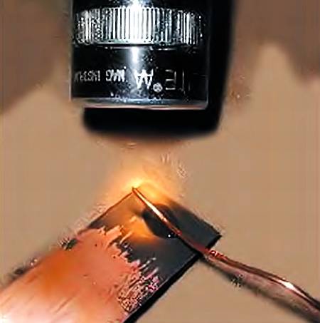Положите на покрытую окислом поверхность меди кусок проволоки, посыпьте ее поваренной солью и нагрейте на газовой горелке. Соль расплавится и застынет в виде твердой прозрачной капли. Если осветить эту каплю ярким лучом света, то между проволокой и пластинкой появится напряжение 20–50 мВ. Вот вам и фотоэлемент. (Судя по нашим опытам, фотоэффект наблюдается и тогда, когда на поверхность окисленной меди наносится обычная капля соленой воды, а в нее вводится тонкая медная проволока.)