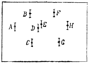 Рис. 8. Точки являются экспериментальным доказательством существования нового унитарно-симметричного октета. Некогда раскрашивать эту картинку. Отсылайте её в «Phys. Rev. Letters» или «New York Times» немедленно!