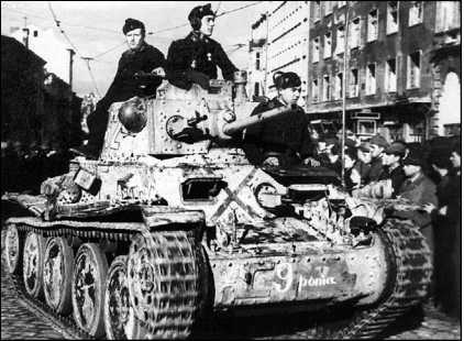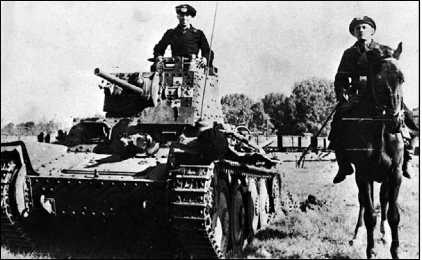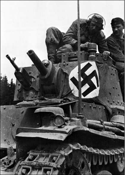 Танк Pz.38(t) Ausf.G въезжает в ворота советской воинской части. На транспаранте между портретами Сталина и Тимошенко надпись: «Да здравствует наша родная Красная Армия — могучий оплот мирного труда народов СССР». 1941 год.