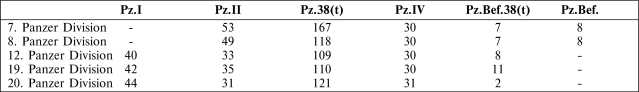 Четыре танковых дивизии (7, 12, 19 и 20-я) входили в состав 3-й танковой группы генерала Гота (группа армий «Центр»), 8- я танковая действовала в составе 4-й танковой группы генерала Гёпнера (группа армий «Север»).
