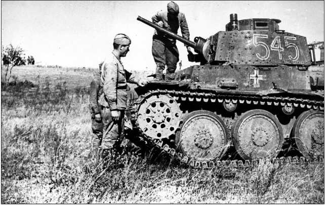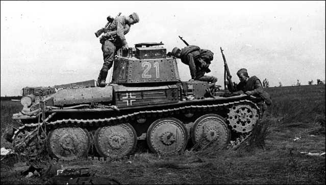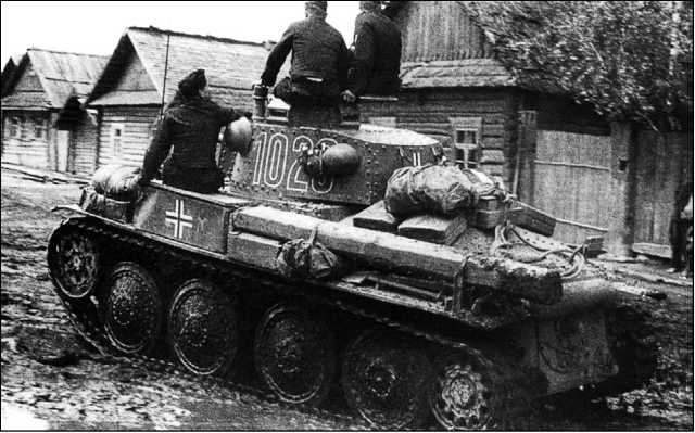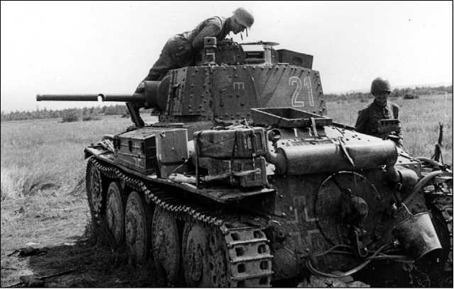 Командирский танк Pz.Bf.Wg.38(t) звена «рота — батальон». Лето 1941 года. Ствол орудия, по-видимому, отбит попаданием снаряда. Растянутый на броне флаг со свастикой облегчал опознавание машин немецкой авиацией.