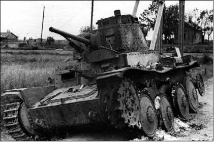 Pz.38(t) Ausf.A (либо Ausf.B ранних выпусков), подбитый советскими войсками в Белоруссии, 1941 год. Эту машину отличают антенный ввод чехословацкого типа и амбразура прицела раннего образца с одним отверстием.