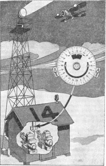 Ночью же вы явственно услышите работу мотора и жужжание динамомашины. А взглянув на вершину мачты, увидите яркий пучок света, бросаемый прожектором. Прожектор вращается, и пучок света описывает по небу широкие круги.