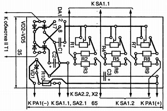 Резисторы R3, R6 и R9 должны точно соответствовать указанным номиналам. Стабилитрон VD1 и конденсатор С3 служат для защиты стрелочного прибора от перегрузок и резких бросков стрелки. В качестве трансформатора можно использовать выходной трансформатор кадров от старых ламповых телевизоров ТВК-110А, ТВК-110ЛМ, ТВК-110Л2. Используется та из вторичных обмоток, которая намотана более толстым проводом (сопротивление которой меньше).