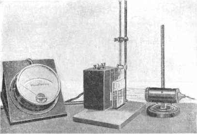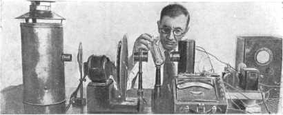 Фотоэлектрический браковщик бутылок инженера Эдриена. Слева, в большом цилиндрическом сосуде — лампа. Справа, рядом с бутылкой — фотоэлемент. Аппарат обнаруживает внутренние напряжения в стекле бутылок.
