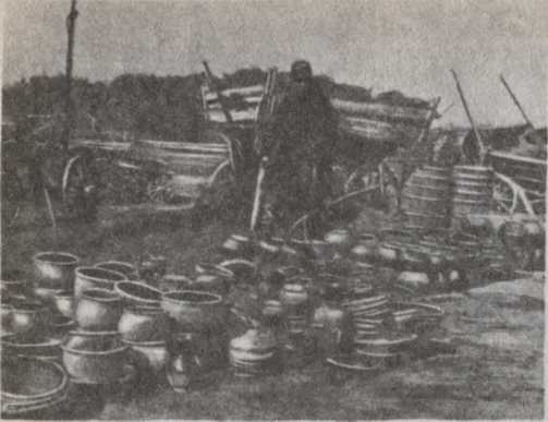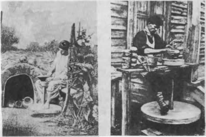 Г оячарство. Найважливішу галузь користування мінеральними річе-аинами становить, звичайно, виріб глиняного посуду. Виріб цей почався й у нас з неоліту і провадився спершу, звичайно, без гончарського кола Иноді навіть просто обмащували глиною посуд, що його плели з очерету або з лози; про це свідчить поверхня старовинних черепків, що їх знаходили у розкопках. У складі цих черепків помітна дуже часто велика домішка товчених скойок, а на поверхні видно відбитки, зроблені просто пальцями, ножем, зазубреним патичком тощо. В наші часи не тільки такий посуд, але й посуд, зроблений на примітивному ручному колі, одійшов у царину доісторичної археології, і весь відомий тепер посуд виробляється на колі, хоч способи його виробу, як мн побачимо далі, ще дуже примітивні.