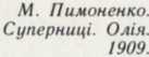 мочать, складаючи коношію на дно мілкої річкн чи ставу та вкриваючи її мулом. Коли конопля досить вимокла, її виймають з води, знову сушать, потім труть на терниці, а потім тіпають, міцно вдаряючи нею об ту саму терницю, а після того те мнуть її ногами. Позбавившись таким способом цілком од кострики, зв'язують прядиво в мички та, насадивши його на прядку, спершу чешуть, а потім прядуть з нього нитки. Колишню прядку, що складалася з dwut^a, в яке вставлений гребінь, вже починають заступати майже всюди західньоевропейські самопрядки: шодо архаїчних веретен з кам'яною пряслицею, то вони зовсім уже заникли, хоч де-не-де, особливо у гуцулів, утримались те веретена з нерухомим, а то те й з рухомим дерев'яним кружком біля нижнього кінця. А сучасні веретена всі точені, з ступневим стовшенням донизу. Про прядки, оздоблені, розмальовані та різьблені, на Україні немає й згадки.