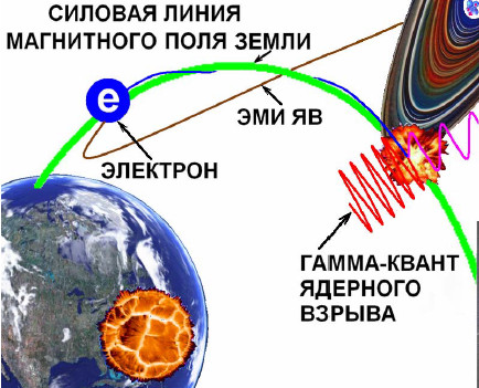 В иллюстрации Комптон-эффекта (вверху), вызывающего формирование ЭМИ ЯВ, многие объекты стилизованы: электромагнитные излучения изображены простыми синусоидами, хотя они представляют синхронные колебания напряженностей электрического и магнитного полей.
