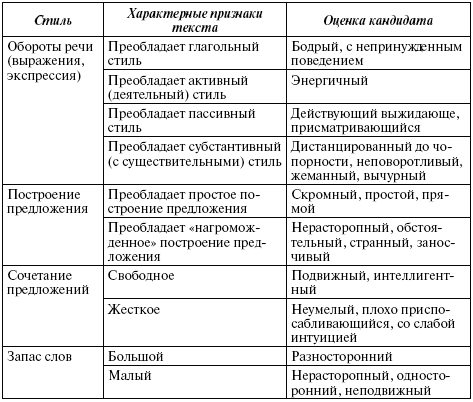 Стиль[109] заявления. Чаще всего стиль письма исследуется по двум направлениям – динамическому и статическому. В каждом из направлений выделяют «чрезмерно динамический» и «чрезмерно статический» стили. Первый – знак одухотворенности и решительности кандидата, второй – бoльших упорядоченности и проявления однопорядкового мышления. Динамический стиль можно распознать по живому и ясному воспроизведению мыслей, статический – по более формальному и деловому повествованию.