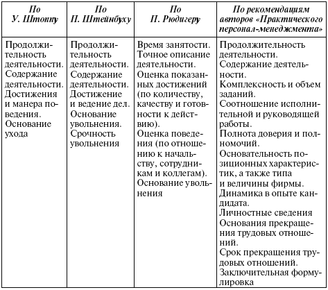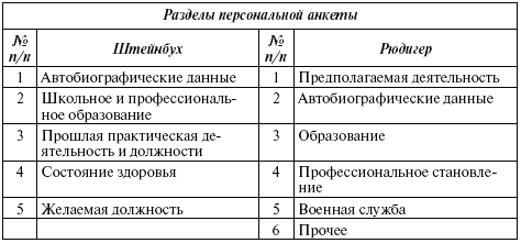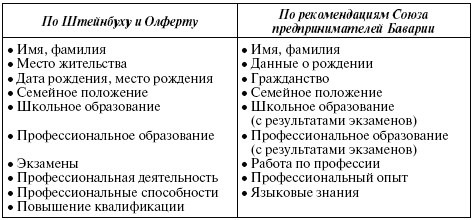 Содержание биографии, как таблично построенной, так и представленной в свободном изложении, должно по своей полноте, точности и даже по характеру языковых выражений удовлетворять ожиданиям предприятия. Большинство специалистов склоняется к практически единой структуре биографий, которые содержательно различаются числом обозначенных позиций (табл. 5.17).