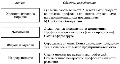 По-разному предприятия осуществляют и селекцию биографий. Разница прежде всего проявляется в выборе объекта анализа (набора анализируемых элементов). Большинство практиков предпочитают двухэлементный объект анализа: 1) хронологический порядок описания событий и 2) должностные изменения. Другие предусматривают еще два элемента: смена фирм и отраслей и непрерывность развития кандидата (рис. 5.10).