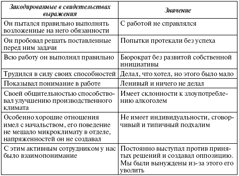 Реакцией работодателей на требование «сужения свободы формулировок» стала выработка, во-первых, «косвенных выразителей», посредством которых неблагоприятные качества и неблаговидные поступки кандидата в документе кодируются (фрагмент одной из версий кодирования приведен в табл. 5.21). Существует мнение, что каждое второе из 15 млн ежегодно пересылаемых для найма трудовых свидетельств в Западной Германии сформулировано на языке «предпринимательского уговора».