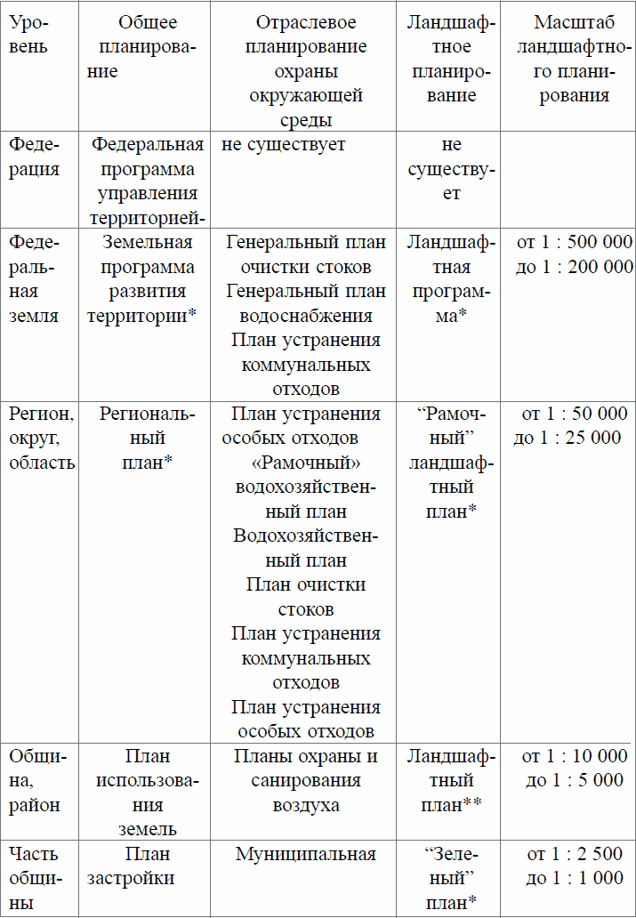 Ландшафтное планирование анализирует ландшафт как пространство жизни людей. Этим пространством занимаются также территориальное планирование, а именно – земельное, региональное и строительное планирования (в их основных формах – планах землепользования и планах застройки), а также специальные отраслевые планирования (например, транспортное или лесное). Все они выполняются на различных масштабных уровнях, как правило, соответствующих уровням административно-территориального деления. По этому принципу организовано и ландшафтное планирование, которое в соответствии с федеральным законом об охране природы должно выполняться на трех или, как минимум, на двух уровнях (табл. 17).