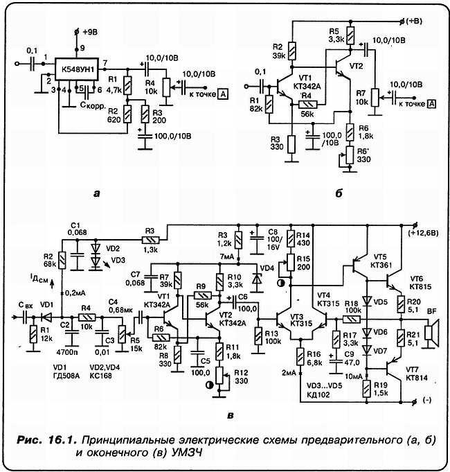 «А»: Я имел в виду построение предварительных каскадов УМЗЧ. Вот они — выбирай (рис. 16.1, а, б).