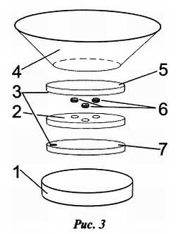 Он состоит из двух дисков 3 с контактными поверхностями, между которыми зажаты три таблетки угля 6. Собирают датчик так: ко дну футляра 1 приклеивают опорную контактную пластину 7 из фольгированного гетинакса фольгой вверх, припаивают к ней вывод 3, саму её поверхность тщательно до блеска зачищают мелкозернистой наждачной бумагой. Затем укладывают и приклеивают к фольге диск 2 с отверстиями для таблеток. Его толщина должна быть меньше толщины таблеток. Потом укладывают в отверстия таблетки. Затем полируют фольгу верхнего диска 5, припаивают вывод 3 и приклеивают диск к дну чаши 4 (фольгой вниз). Накладывают чашу на основание и выводят контактные провода. При нажатии с переменным усилием на дно чаши сопротивление датчика должно меняться приблизительно от 100 до 20 ом.
