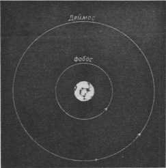 Впрочем, сами эти небесные тела вряд ли могут внушать те чувства, о которых говорят их названия. Скорее, напротив, они умиляют нас своими крошечными размерами. Спутники Марса принадлежат к числу наименьших из известных нам тел солнечной системы. Ближайший к Марсу Фобос имеет диаметр 16 километров, а Деймос и того меньше — всего 8 километров. Это — самые маленькие из лун солнечной системы. Тяжесть на их поверхностях ничтожно мала, а потому спутники Марса лишены атмосфер, а стало быть, и жизни. Деймос отстоит от центра планеты на расстоянии 23 500 километров, а Фобос — всего на расстоянии 9376 километров. Иначе говоря, от поверхности Марса до Фобоса расстояние меньше, чем от Москвы до Владивостока.