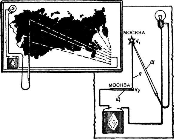 Рис. 39. Монтажная схема электрификации географической карты: К1 и К2 — контакты; Щ — щупы; П — провод.