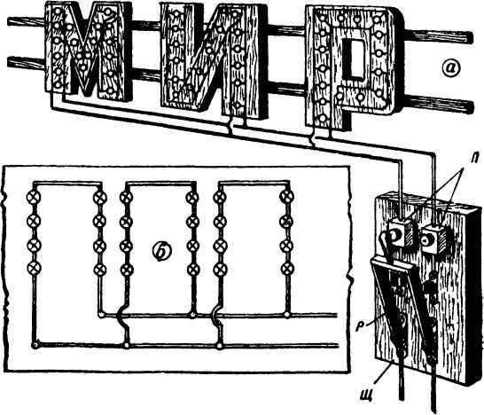 Попробуйте электрифицировать сначала короткий лозунг, например «Миру мир» или «Добро пожаловать!» Сколотите буквы из дощечек и скрепите их рейками. На буквах разметьте места для крепления патронов. Патроны желательно брать «сидячие», настенные, которые применяются для дежурного освещения. Возьмите лампочки самой малой мощности (15–20 ватт), их напряжение должно соответствовать напряжению сети (120 или 220 вольт). Соедините все патроны между собой параллельно. Присоедините к лозунгу провода с хорошей изоляцией и включите его через предохранительные пробки и двухполюсный рубильник в осветительную сеть, как показано на рисунке 41, а.