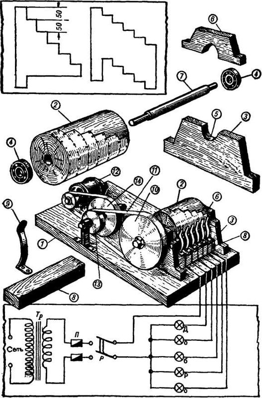 Смажьте подшипники тавотом и закройте их с боков металлическими накладками. К основанию прикрепите рейку 8 так, чтобы скользящие контакты 9 плотно прижимались своими выступами к поверхности барабана. Соедините шкив 10 контактора через промежуточные шкивы 13 и 14 и ременную передачу 11 с валом электродвигателя 12, взятого от оконного или настольного вентилятора.