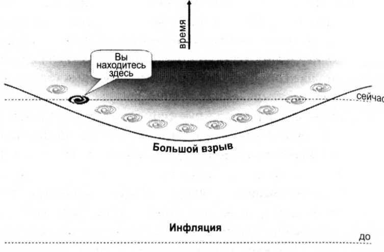 Внутренний вид островной вселенной представлен на рисунке 10.2. Как и раньше, момент Большого взрыва изображен сплошной кривой, помеченной "Большой взрыв". Плотность вещества во всех событиях на этой кривой практически одинакова и определяется плотностью распадающегося ложного вакуума. Таким образом, на локальном виде островная вселенная почти однородна. Настоящий момент времени здесь представлен пунктирной линией, помеченной "сейчас", которая совпадает с рядом галактик на рисунке. Все точки на этой линии характеризуются одинаковой средней плотностью вещества и одинаковой концентрацией звезд — такой же, как наблюдается вблизи нас. Но самое замечательное — с локальной точки зрения островная вселенная бесконечна!