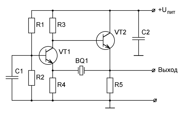 В первую очередь речь идет о схемотехническом решении кварцевого генератора по схеме Батлера, выполненного на двух транзисторах. Отличительной особенностью данной схемы транзисторного ВЧ-генератора, характеризующегося качеством, надежностью и универсальностью, является включение кварцевого резонатора в цепь обратной связи между эмиттерами транзисторов. Различные модификации этой схемы широко используются при разработке генераторов с частотами от 10 МГц до 200 МГц.