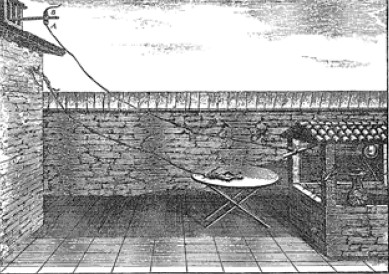 Обнаружив влияние электричества на лягушачьи лапки, Гальва-ни предположил, что все дело в электрических искрах. Но если слабая искра электрической машины заставляет лягушачью лапку дергаться, то что должно произойти во время грозы, при блеске молнии?.. Надо только дождаться грозы. И когда желанная погода наступила, ассистенты синьора профессора тотчас же отправились к соседнему пруду, откуда обычно черпали материал для экспериментов. Правда, злые языки утверждали, что после демонстрации студентам мясистые лапки частенько шли в кастрюльку, обеспечивая не только духовную пищу достопочтенному экспериментатору и его болезненной супруги. Но чего не говорят люди…