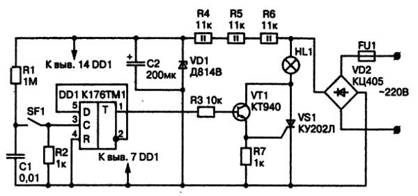 Когда выходят из помещения и открывают дверь, размыкание контакта SF1 и отрицательный перепад не влияют на состояние автомата. Но при втором закрывании двери положительный перепад на входе С триггера переключает его, на прямом выходе появляется уровень лог. 0 (как на входе D), транзистор и тиристор запираются, лампа гаснет, а на инверсном выходе триггера устанавливается уровень лог. 1. Схема возвращается в исходное состояние. К тиристору в закрытом состоянии приложены положительные полуволны синусоидального напряжения сети с максимальной амплитудой 327 В. Поэтому использование в схеме тиристора КУ202Л с предельным напряжением в закрытом состоянии 300 В чревато пробоем. Вместо него следует применить КУ202М или КУ202Н.