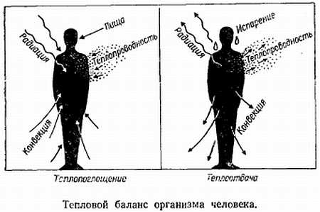 Но наш организм не может накапливать слишком большие запасы тепла. Ему необходимо избавляться от излишков тепла; это достигается четырьмя способами: испарением (когда выделяется пот, организм охлаждается), теплоизлучением, конвекцией и теплопроводностью. Какое-то количество тепла уходит с испражнениями.