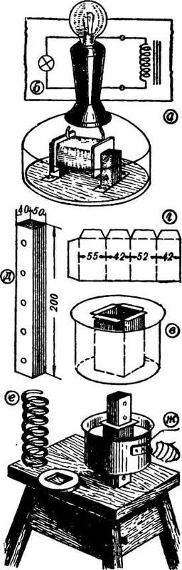 Рис. 64. Конструкция приборов: а — устройство «волшебной лампы»; б — схема включения лампы; в — конструкция кастрюли; г— выкройка внутренней стенки кастрюли; д — конструкция сердечника; е — соленоид; ж — демонстрация электроплавки (на столе, слева, лежит алюминиевое кольцо, необходимое для демонстрации действия вихревых токов).