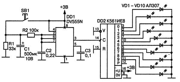 Счетчик DD2 также остановится и окажется горящим один светодиод. При следующем нажатии пусковой кнопки произведению R2xС2, не изменяется, но после отпускания кнопки через R1 начинает разряжаться конденсатор С1 и напряжение на нем уменьшается. Понятно, что чем ниже напряжение на С1, тем больше требуется времени для заряда С2 от 1 В до 2 В. Так плавно увеличивается период повторения импульсов, и, когда С1 разрядится до 2 В, конденсатор С2 зарядиться до 2 В уже не сможет, триггер остановится. Счетчик DD2 также остановится и окажется горящим один светодиод. При следующем нажатии пусковой кнопки процесс повторяется.