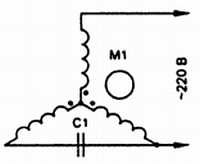 Для питания трехфазного асинхронного двигателя от однофазной сети используют конденсатор, сдвигающий фазу напряжения питания одной из обмоток. Подключение фазосдвигающего конденсатора к обмоткам двигателя, соединенным звездой, показано на рис. 21. Подключение фазосдвигающего конденсатора к обмоткам двигателя, соединенным треугольником, показано на рис. 22.