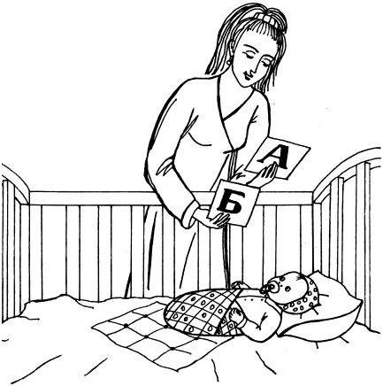 Сначала вывешивается или демонстрируется одна или две буквы. Затем, ежедневно, еще по одной букве. К концу первого месяца подобных занятий на развивающем стенде будут все буквы русского алфавита. Когда, проснувшись, младенец видит знакомую букву, у него «поднимается» настроение, и он может даже заулыбаться. Это сигнал для вас – он выучил букву, узнает ее. После того как все буквы будут вывешены на стенде, вам нужно дать каждой букве имя – произнести звук. Вскоре вы будете называть малышу букву, а он будет глазами искать ее на стенде.