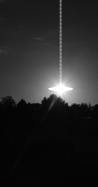 Объект был похож на половину двояковыпуклой линзы, разрезанной пополам. Куполообразный, сильно растянутый по горизонтали, он висел недвижимо на одном месте. От его плоского днища до земли было, по оценке Железняка, метра четыре или пять. Сам по себе объект не светился, однако вокруг него разливалось голубоватое сияние. Вниз от объекта во всю его ширь уходил к земле дымный столб, четко очерченный по краям: