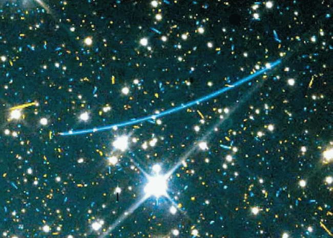 Голубой росчерк оставил на снимке, сделанном 5 марта 1998 г., сближающийся с Землёй астероид