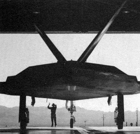 Малозаметный истребитель выкатывается из ангара на секретной базе в пустыне Невада на испытательном полигоне Тонопа.(Фото Денни Ломбарда и Эрика Шульцингера)