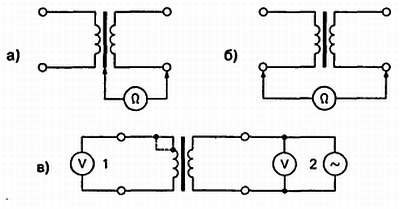 Проверка на короткое замыкание между обмотками, между обмотками и корпусом производится с помощью омметра (рис. 4.6а,б). Прибор включают между выводами разных обмоток, а также между одним из выводов и корпусом. Так же проверяется и сопротивление изоляции, которое должно быть не менее 100 МОм для герметизированных трансформаторов и не менее десятков мегаом для негерметизированных.